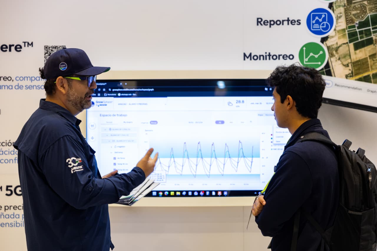 En las demostraciones, los asistentes pudieron visualizar cómo GrowSphereTM integra información capturada por los sensores y cómo esta se organiza en dashboards que permiten revisar condiciones del cultivo, generar reportes y recibir alertas desde cualquier dispositivo. La conversación se centró en las oportunidades y facilidades de contar con toda la información en la palma de la mano, de manera clara, accesible y en tiempo real.